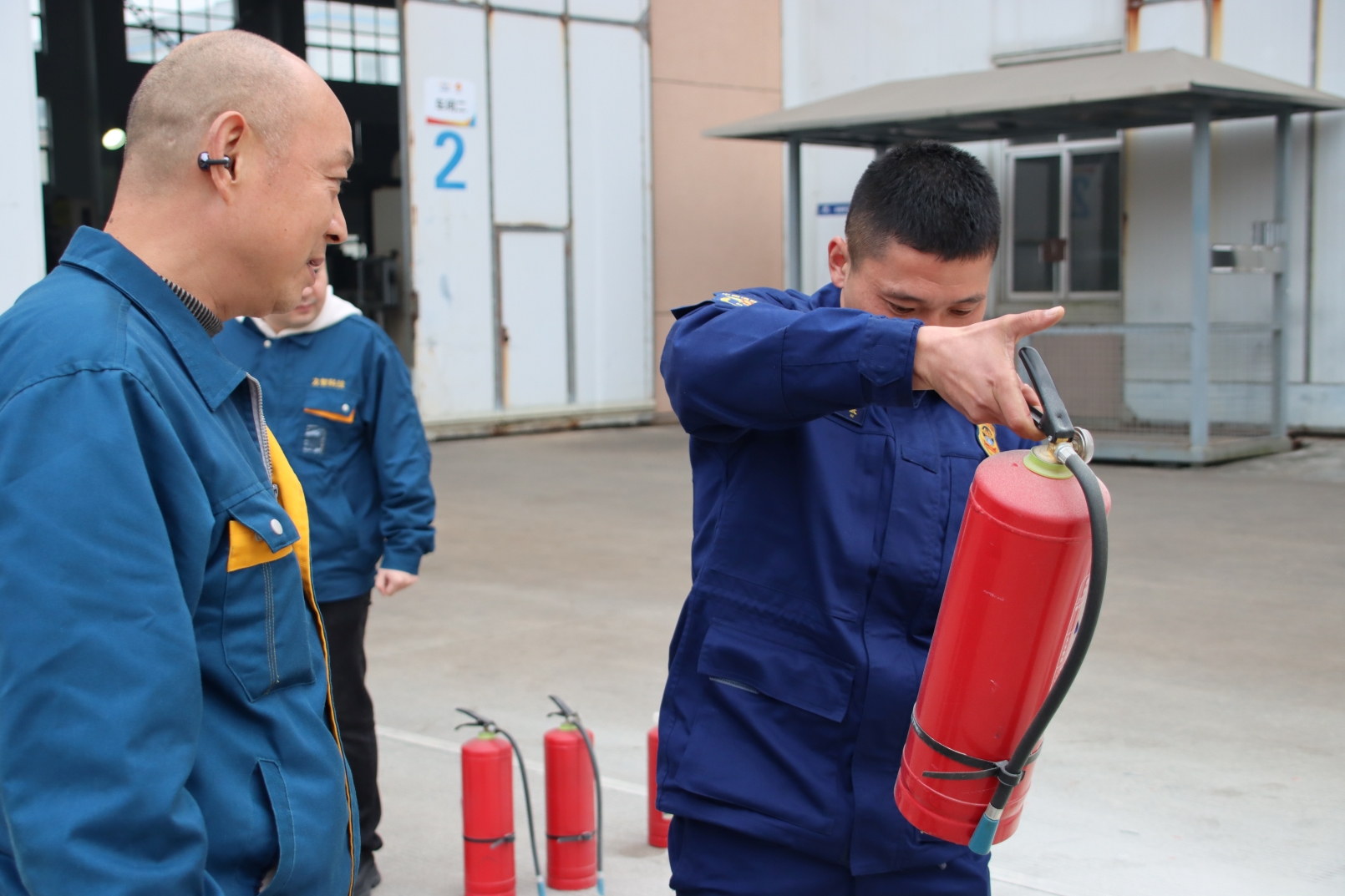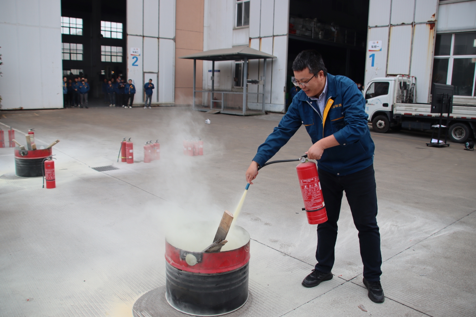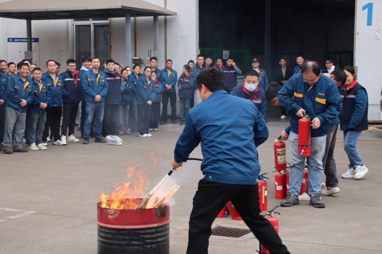 在林隊長的專業(yè)指導(dǎo)下,員工進(jìn)行滅火器操作實踐。